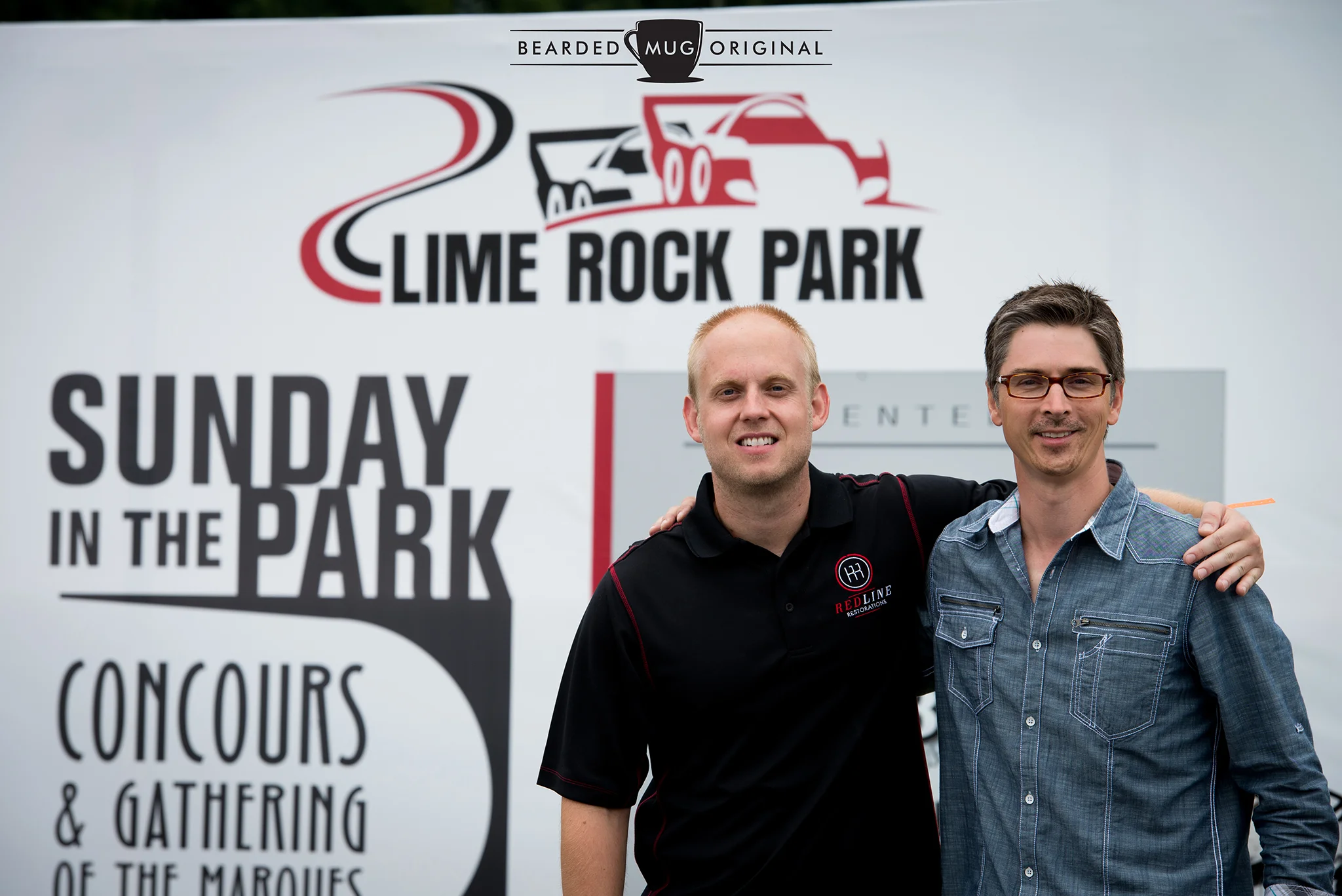 PJ from Redline Restorations and Dwight from The Little Red Racing Car pose in front of the official backdrop.