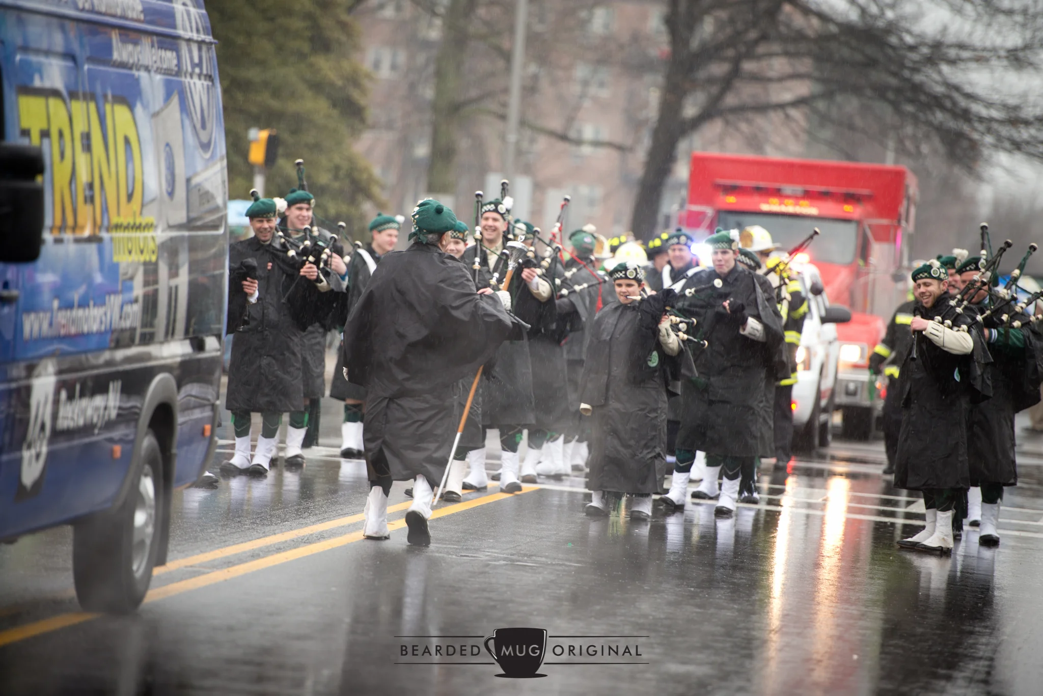 As anticipated, the parade was a success. But not the type that can be measured in attendance alone. That. clearly, was significantly underwhelming. However, it's the smiles on the spectators' faces as the pipes marched by that can be seen as a win. It was the dedication of the people, both participants and watchers, that really made the day triumphant. Umbrellas abounded, but for some, standing open in the rain didn't faze them. No one was melting.