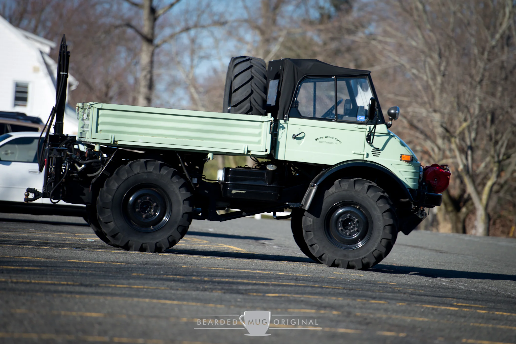 This Unimog, brought by Stony Brook Farm, is outfitted with everything that makes the Unimog badass; giant knobby tires with a spare, winch, canvas top, snorkel (not pictured), and some sort of hydraulic attachment on the rear.