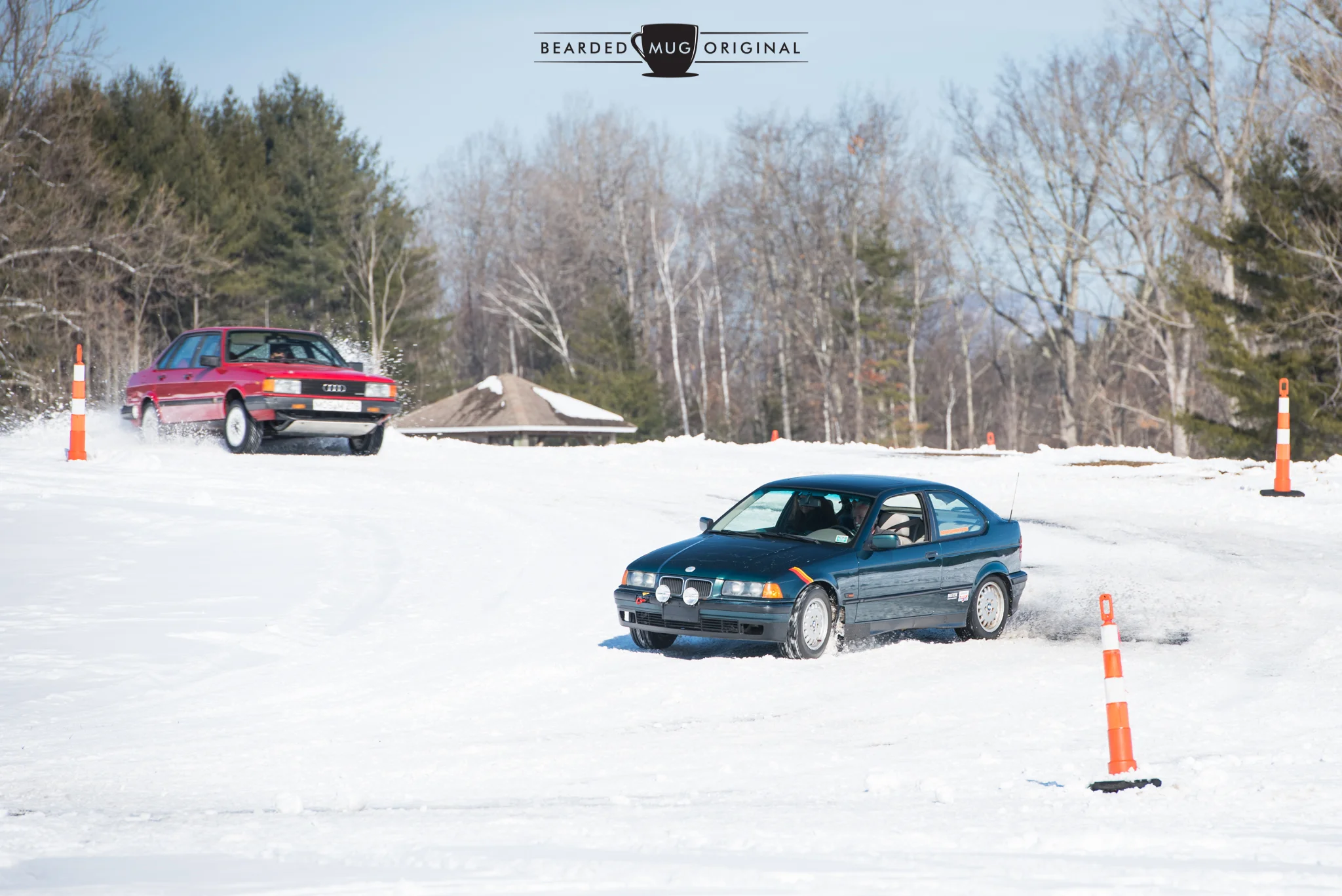 Anyway, the short time I spent tossing the R around (at slower speeds, mind you) was a great glimpse into how well the AWD could tackle treacherous conditions, even when handicapped with summer-specific rubber. But it wasn't over yet. The instructor, Travis, also had two E36 BMWs on hand for members to use. One was a four-door 325i and the other a 318ti hatch. Both had manual transmissions and snow tires, and had logged and been flogged thousands of miles. The rear-wheel-drive Bimmers were certainly more prone to spinning, but the snow tires did their best to prevent that from happening. And with what appeared to be a TCS light flashing on the dashboard, both cars were all analog. I need not worry about any electronic nannies stepping in to stop the fun. But again, being a novice behind the wheel of someone else's car, I wasn't exactly pushing hard, and I never managed to embarrass myself by swapping the front with the rear of the car. Great success.