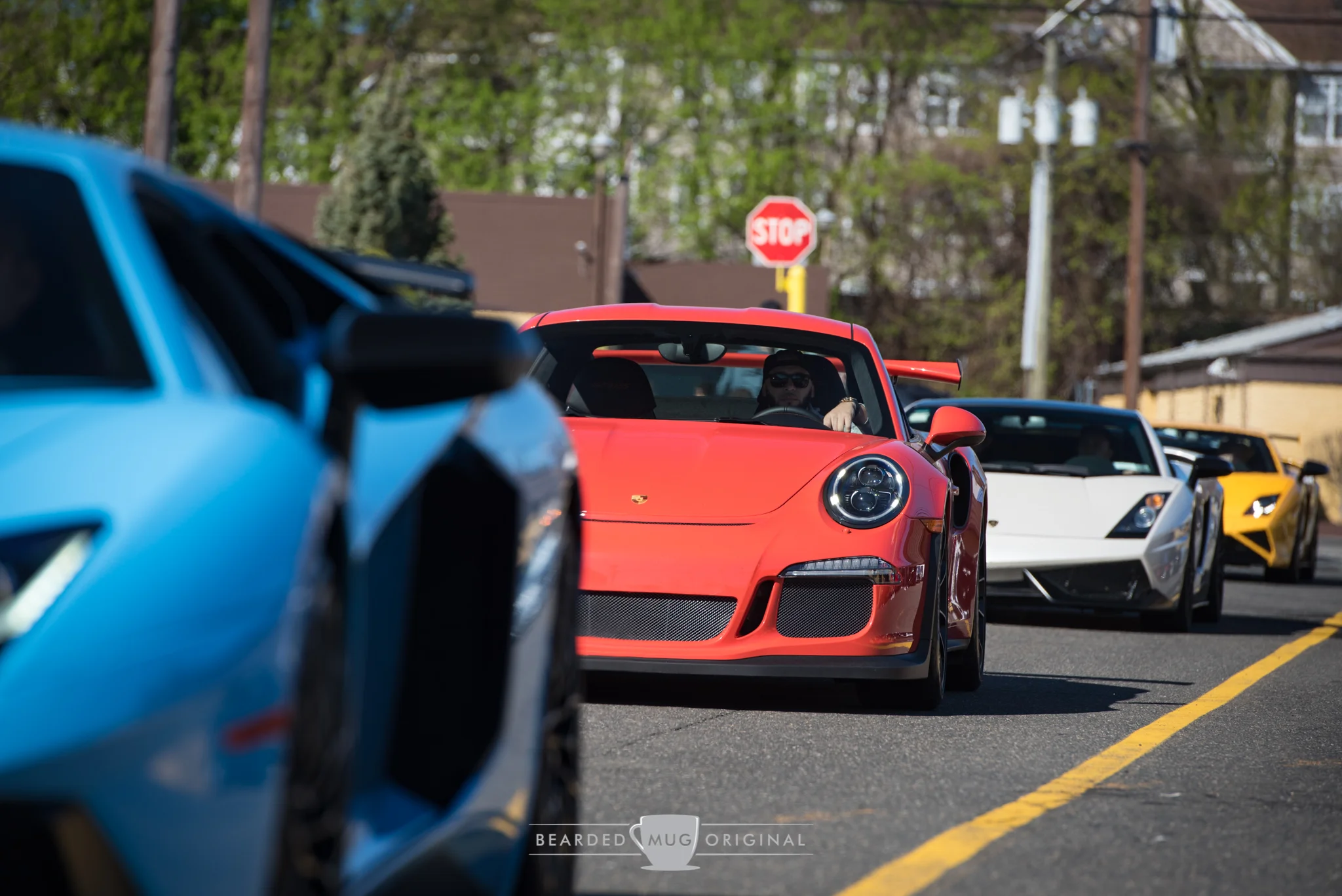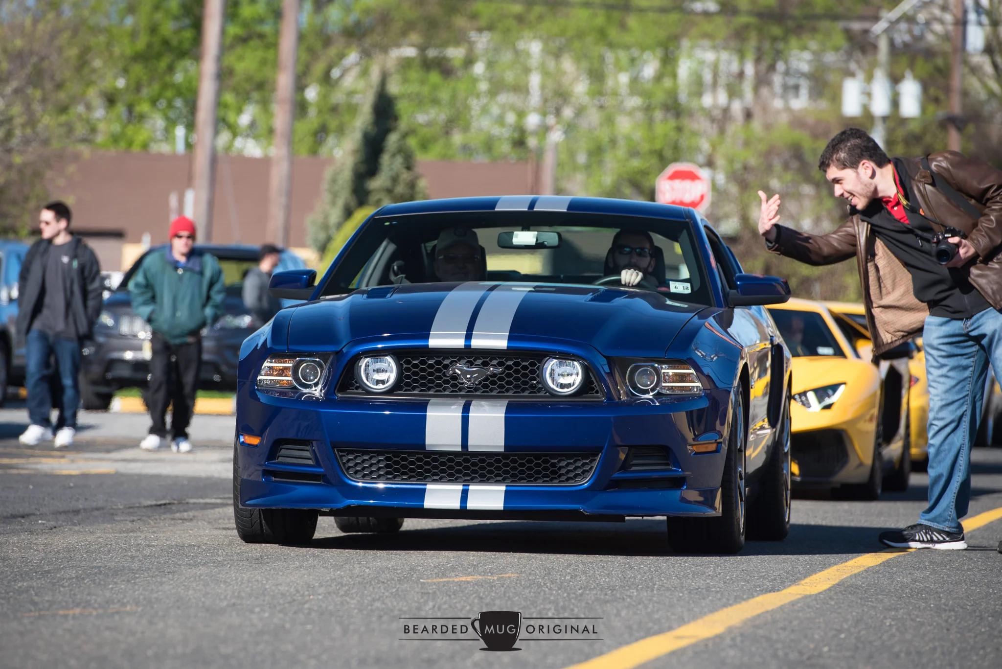 Tony Boniello, the founder of Bergen County Cars & Caffe, can be seen shooing a Mustang along shortly before he slipped into an Aventador SV and drove off into the...parking lot.